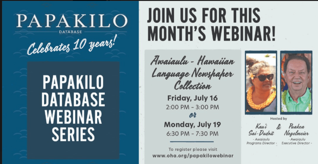 If you are free tomorrow afternoon, check out the webinar on Hawaiian language newspapers put on by Papakilo Database and Awaiaulu. Click the image below to be taken to the registration page!