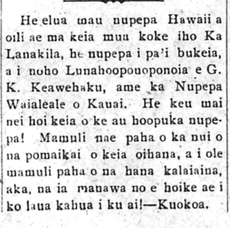 There are two Hawaiian newspapers that will be appearing very soon, Ka Lanakila, and newspaper published as a book and edited by G. K. Keawehaku, along with Ka Nupepa Waialeale of Kauai. This is indeed a great time for publishing newspapers! Perhaps it is because of the many benefits of that profession, or perhaps because of political movements, but time will tell the platforms upon which they stand!—the Kuokoa.