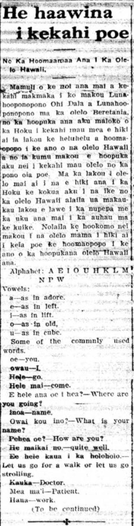 Because some friends requested of our Circulation Manager and Editor in English [J. B. Dickson] to publish in the Hoku some things so that they could read and understand the nature of the Hawaiian words, and therefore, we print some words for the benefit of those people. According to what they said, should the Hoku be able to assist in with knowledge of the Hawaiian language, then they would be prepared to subscribe to the newspaper and pay upfront for the subscription. Therefore we are publishing some easy words so that these people will understand how to speak Hawaiian.