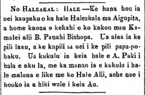 Pertaining to Haleakala Hale—The roof of the house Haleakala at Aigupita, the town home of one of our young chiefs, B. Pauahi Bishop, is being redone. The wooden shingles have been pried off and slate shingles are being laid. This house was built by the late A. Paki, with the thought that a second story would be built like the Palace, but this was not fulfilled until this era.