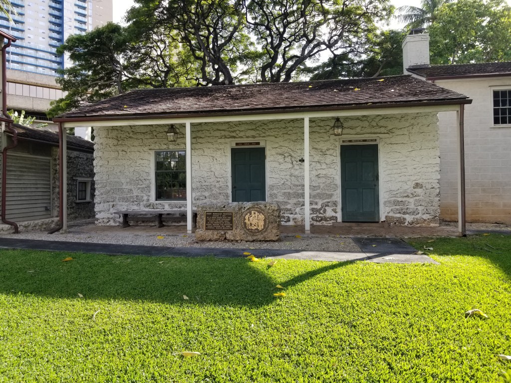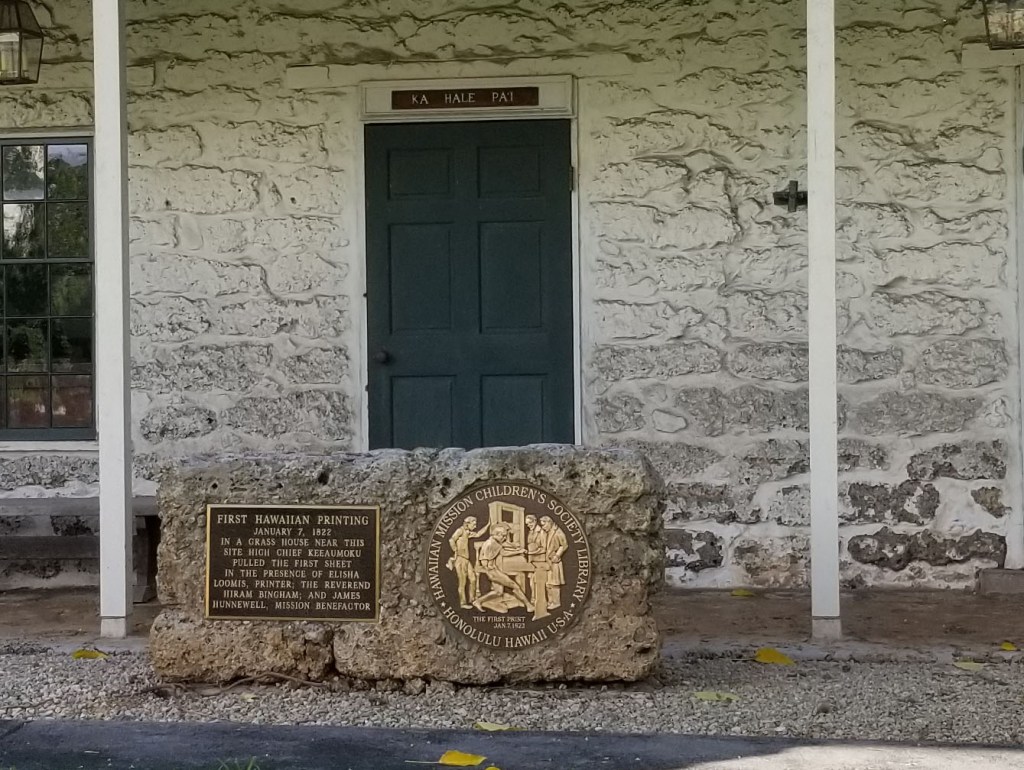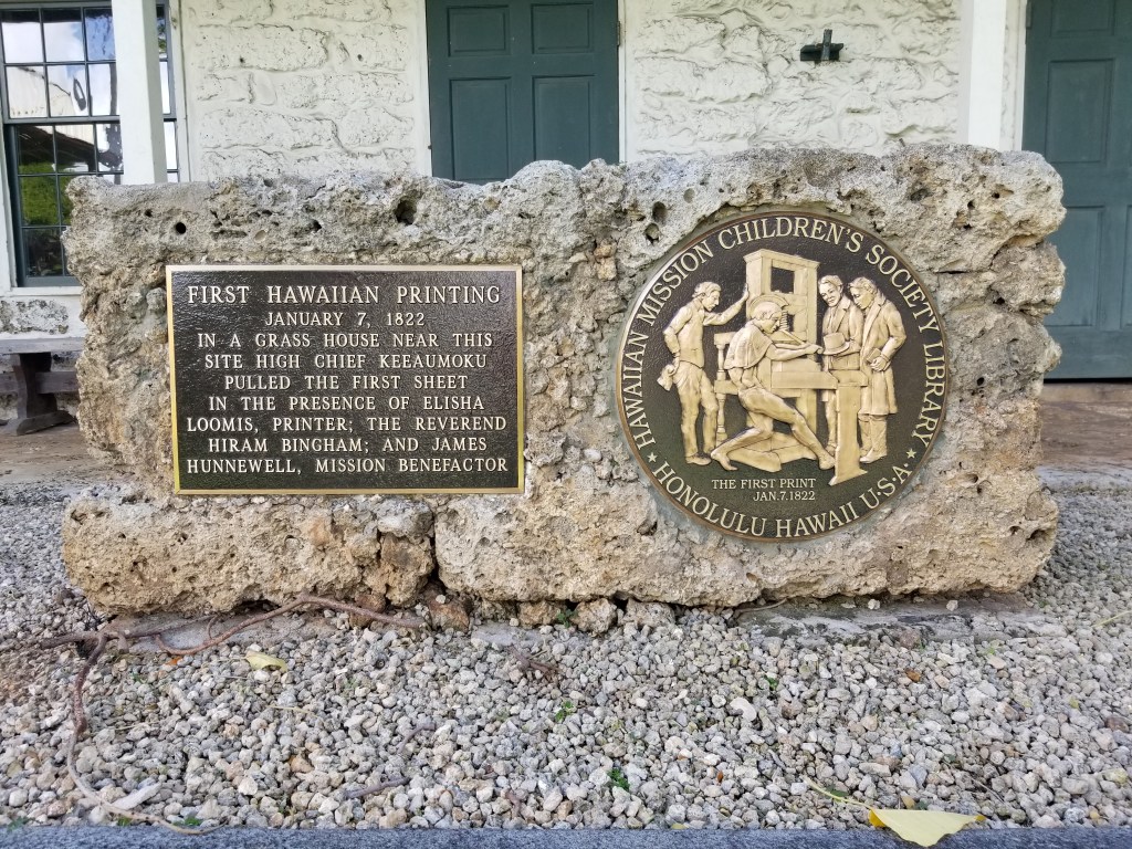 This commemorative plaque is in front of the Hale Paʻi at the Hawaiian Mission Houses in Honolulu. Tomorrow morning they are having a historic reenactment of the 1822 press pull in person and livestreamed as well!