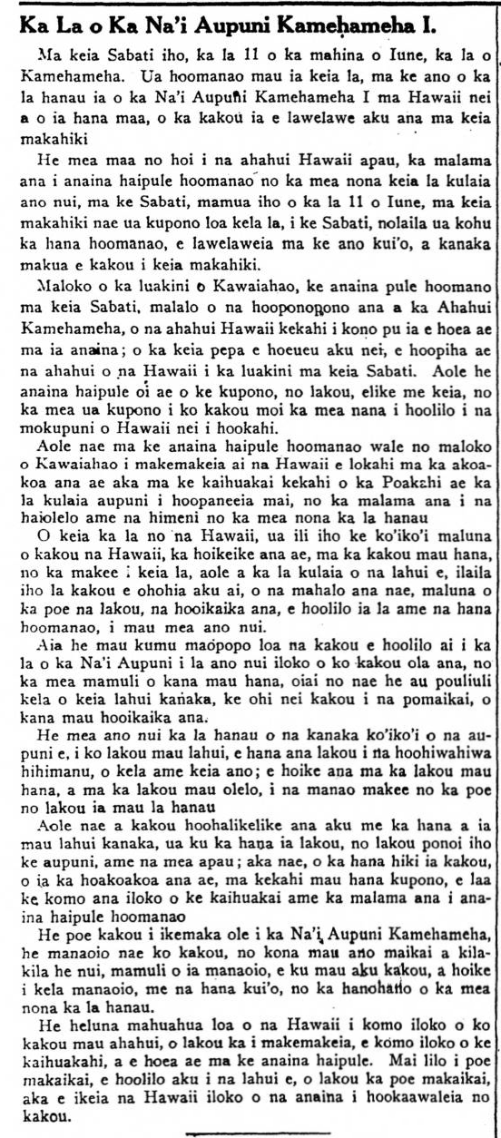 This is the day for Hawaiians; it is our responsibility, O Hawaiians, to show through our actions our affection for this day; it is not for the holidays of the other people that we should show our enthusiasm, but we should have admiration for those who work hard to make the day and commemorative activities significant.