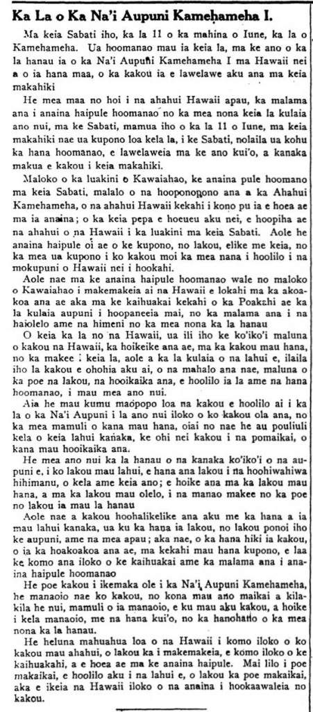 It is a usual thing for all the Hawaiian associations to hold a memorial service for the one for whom this important holiday is, on the Sunday preceding the 11th of June. But this year that day falls on a Sunday, so it is appropriate that the memorial activities be carried out with sincerity and maturity by us this year.