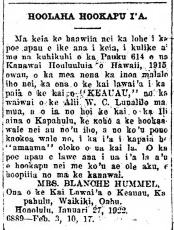 By this, notice is given to all who sees this, as per what is designated in Section 614 of the Assembled Laws of Hawaii, 1915; I, the one named below, the owner of the fishery, known as the sea of “KEAUAU,” from the former property of the Alii William Charles Lunalilo, that being the sea in the Ili aina of Kapahulu, select and set aside for myself, an only for my own use, the fish called, “amaama,” from within those seas. All who take without my permission this fish that I make tabu, will be prosecuted.