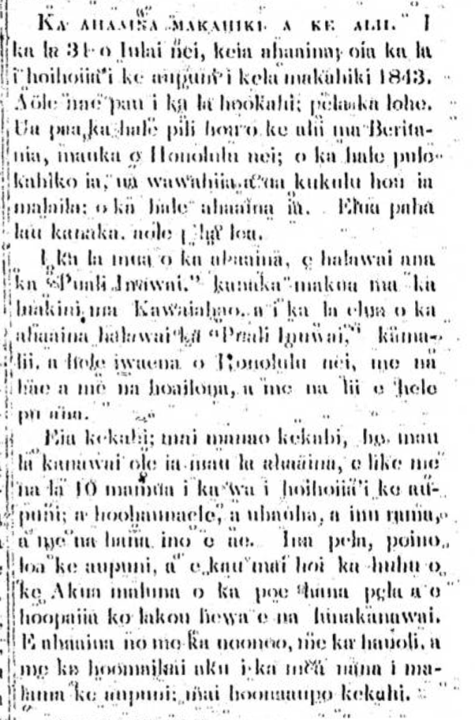 The Royal Anniversary Feast. The feast was on the 31st of July; this was the day that the nation was restored in the year 1843. It will not be over in a single day, as per what is heard. The king’s new pili-thatched house [Haleuluhe] was built in Beritania, upland of Honolulu; it was the old church that was demolished, and it was newly built there. Maybe 800 [elua lau] people would not fill it.