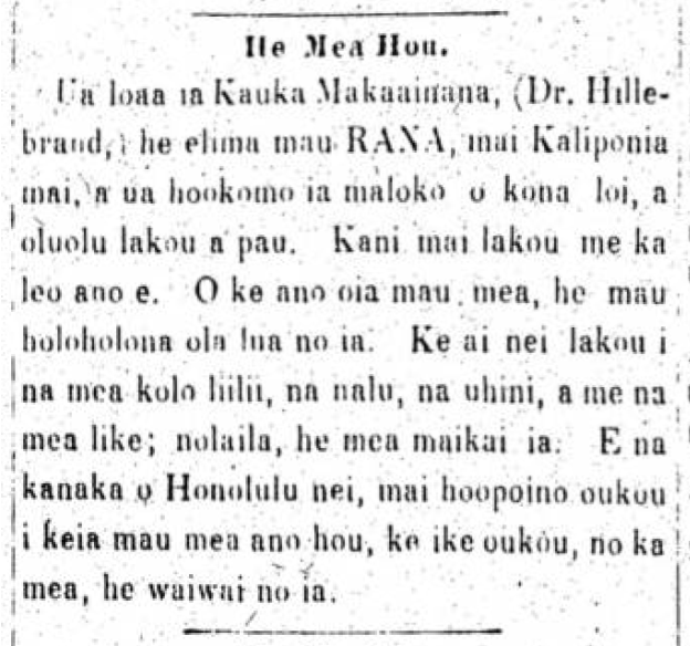 Kauka Makaainana (Dr. Hillebrand) has five FROGS [RANA] from California and he has put them in his taro patch. They are doing fine. They make strange noises. Their nature is that they are animals that have two lives. They eat small bugs: flies, grasshoppers, and other things like that. Therefore they are good. O People of Honolulu, do not harm these new things if you see them, because they are valuable.