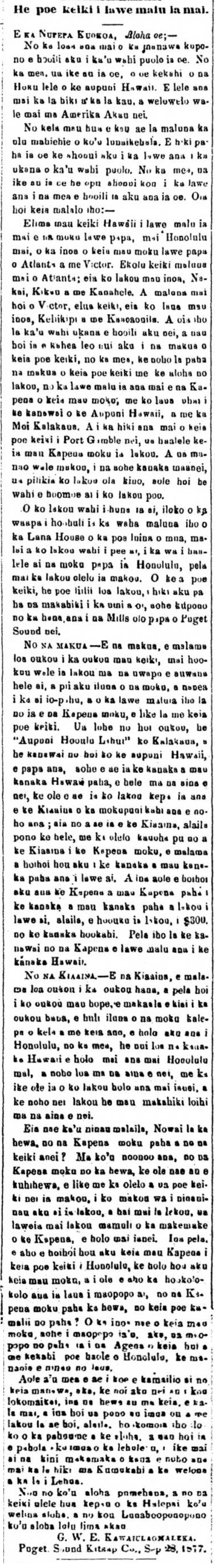 G. W. E. Kawaiulaomaleka, Puget Sound, Kitsap County, Sep. 28, 1877.