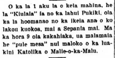 The first of this month [December] was a “Kiulaia” [Holiday] for the Portuguese, that being the day commemorating the recognition of their independence from Spain. From 9 o’clock in the morning, a great mass was held in the Catholic church Malieokamalu.[Maliaokamalu / Our Lady of Peace].