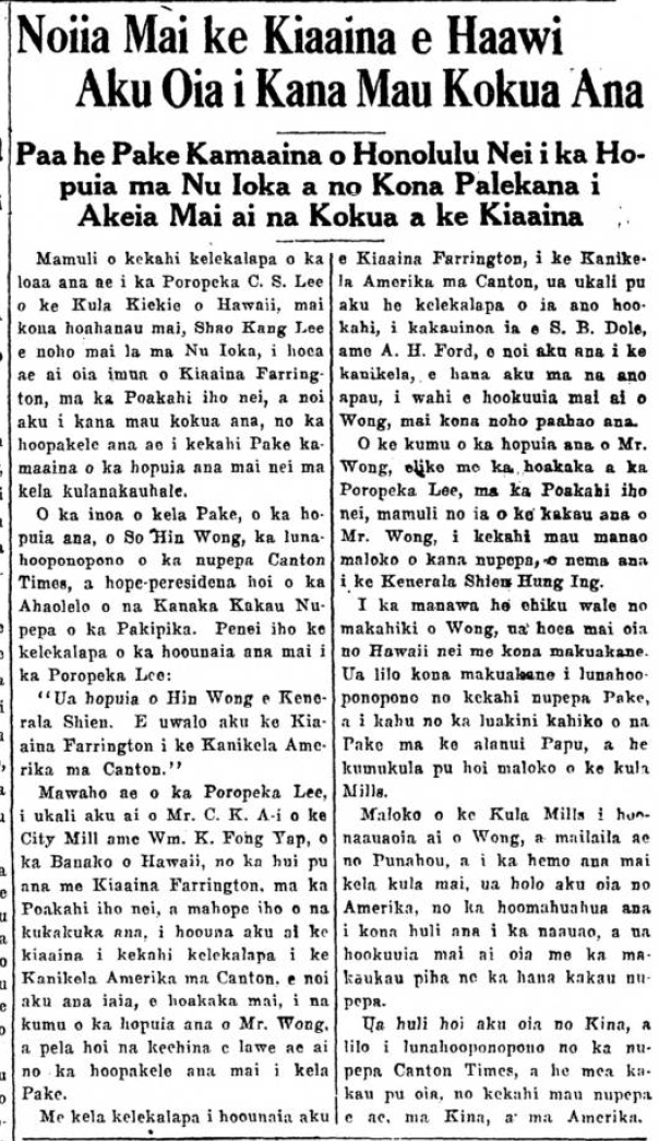 The name of that Chinese that was arrested is So Hin Wong, the editor of the newspaper Canton Times, and vice president of the Pan Pacific Press Congress [ka Ahaolelo o na Kanaka Kakau Nupepa o ka Pakipika]. This is how the telegraph went which was sent to Professor Lee: