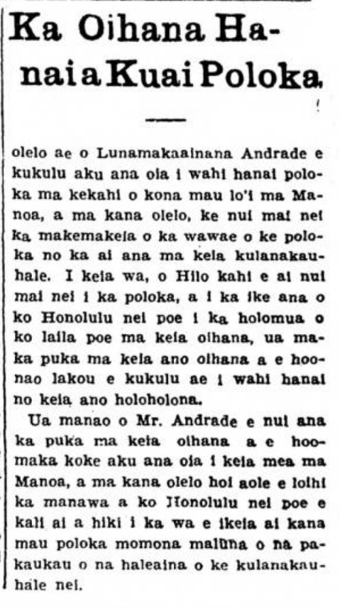 I have nothing more to talk about at this time, but I ask for your kindness, if I am wrong about this, excuse me, and if I am correct before you and them as well, then place it in your bureau of love, and it will be for you to spread it before the public so that our many friends will know, they who live from Kumukahi where the sun rises to Lehua where the sun sets.
