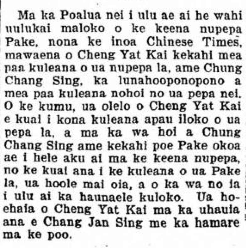 This past Tuesday, an altercation [uulukai] arose in the Chinese newspaper office by the name of Chinese Times [Wah Ha Bo] [華夏報], between Cheng Yat Kai, one of those who holds ownership in that newspaper, and Chung Chang Sing, the editor and also an owner in the paper. The cause was Cheng Yat Kai saying that he would sell all of his interests in the paper, and when Chung Chang Sing and some other Chinese got to the newspaper office to purchase the interests of that Chinese, he refused, and that was when the internal riot began. Cheng Yat Kai was injured by Chang Jan Sing hitting him in the head with a hammer.