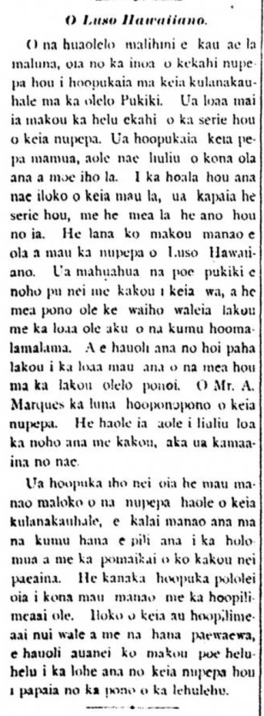 The unfamiliar words placed above is the name of a new newspaper published in town in the Portuguese language. We got a hold of the first issue of the new serie of this newspaper. This paper was published earlier, but it was not long lived before it went to sleep. After being revived these days, it was called a new serie, like it is a new ano [new series]. We hope this newspaper O Luso Hawaiiano will live forever. The number of Portuguese living with us lately has increased, and it would not be good to just have them be without means to gain knowledge. And they will probably be happy to regularly acquire news in their own language. Mr. A. Marques is the editor of this newspaper. He is a haole that has not lived long amongst us, but his is a kamaaina nonetheless.