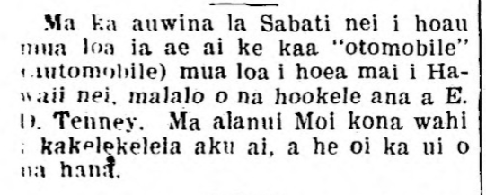 On Sunday afternoon, the first automobile [otomobile] to arrive in Hawaii nei was dedicated, being driven by E. D. Tenney. He glided along King Street and this was truly graceful.