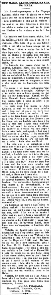 My beloved mama, Luika Kaaha left this life on the 4th of October, 1917, at 11 p. m. at Kamoiliili, and her spirit returned to He who created it, and left her earthly body for me, my dear papa, the grandchildren, and family, who lament on this side of the dark river of death. I grieve for you, my dearly beloved Mama!