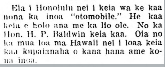 Here in Honolulu currently is a vehicle called an “otomobile.” It is a vehicle that moves without a horse. This car belongs to the Hon. H. P. Baldwin. He is the very first to obtain this vehicle of amazing deeds and name.