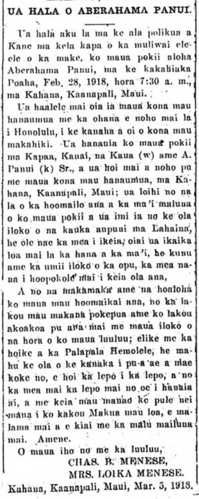Our younger sibling, Abraham Panui has left on the dark path of Kane to far bank of the dark river of death, in Thursday morning, Feb. 28, 1918, 7:30 a. m, at Kahana, Kaanapali, Maui.