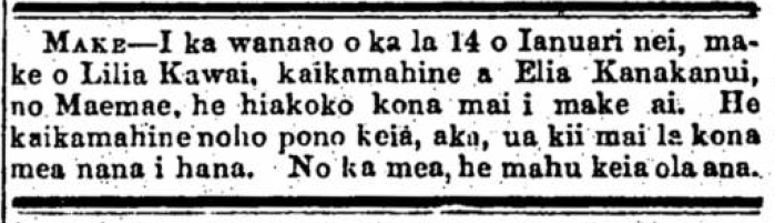 Deaths–In the dawn of the 14th of January, Lilia Kawai, daughter of Elia Kanakanui of Maemae, died. The sickness that caused her death was bloody flux. She was a girl who lived properly, however she was fetched by the one who created her. For this life is a vapour.