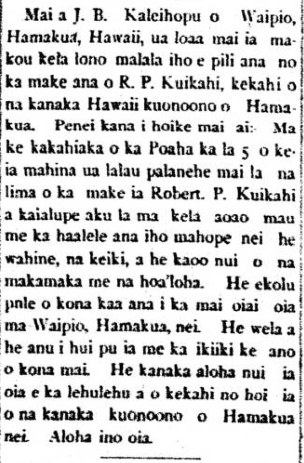 We received from J. B. Kaleihopu of Waipio the news below pertaining to the death of R. P. Kuikahi, one of the wealthy Hawaiians of Hamakua. This is what he said: In the morning of Thursday the 5th of this month, the hands of death quietly seized Robert P. Kuikahi and lead him to the other side. He leaves behind a wife, children, and crowds of intimates and friends. He was sick for three weeks while he was here in Waipio, Hamakua. HIs sickness was a chills and fever combined with acute discomfort. He was a person who was greatly loved by the people, and he was one of the wealthy of Hamakua. What a pity.