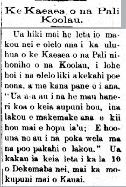 A letter has reached us, speaking of the displeasure of the Hero of the jagged Koolau cliffs hearing the boasts by some about him, and his response being, “I will challenge them even if there be hundreds of soldiers of the new government, if they want to try to capture me again. I will send fiery bullets through each of their heads.” The letter was written on the 10th of December from the island of Kauai.