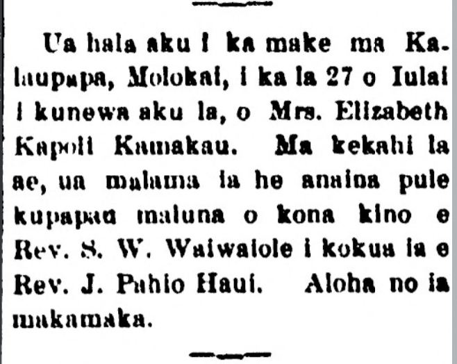 Passed on at Kalaupapa, Molokai, on the past 27th of July, was Mrs. Elizabeth Kapoli Kamakau. Some days later, a prayer gathering was held over the body by Rev. S. W. Waiwaiole, assisted by Rev. J. Pahio Haui. Aloha for that friend.