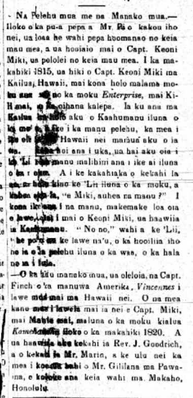 The first Turkeys and the first Mangoes.–In the sheaves of paper belonging to our Mr. ???, there was a memo pertaining to these things, and Captain John Meek [Capt. Keoni Miki] confirmed the information. In 1815, Capt. John Meek arrived in Kailua, Hawaii, as a mate of the ship Enterprise, from Chili, on a trading voyage. When he landed in Kailua, Kaahumanu boarded the ship and saw the turkeys, which were not seen here in Hawaii before that. She went back to shore and told the King about the unfamiliar birds she saw on the ship. In the morning of some following day, the King boarded the ship in person and called out, “O Miki, where are the birds?” When he saw the birds, he very much wanted to take them, but John Meek said that they were given to Kaahumanu. “No, no,” said the King, “I should take them for myself.[“] They were placed upon a canoe and taken ashore.