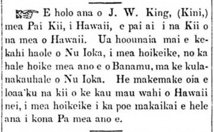 Kauka Makaainana (Dr. Hillebrand) has obtained five RANA (frogs) from California, and put them in his irrigated terrace, and they are all doing fine. They have a strange call. The nature of those animals is that they have two lives. They eat small creeping insects, flies, grasshoppers, and other things like that. Therefore it is a good thing. O People of Honolulu, do not harm these new things should you see them, because they are valuable.