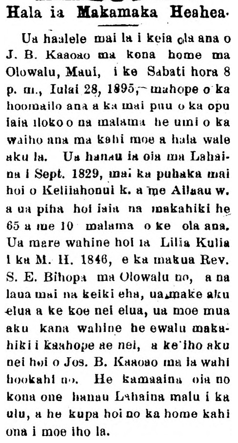 J. B. Kaaoao has left this life at his residence at Olowalu, Maui, this Sunday at 8 p.m., July 28, 1895, after wasting away from a tumor [mai puu] of the stomach, where he was bedridden for ten months and he died. He was born at Lahaina in Sept. 1829, from the loins of Keliiahonui (m) and Ailaau (f). He was 65 years old and 10 months. He was married to Lilia Kulia in 1846 by Rev. S. E. Bishop at Olowalu, and the couple had four children, two died and two survive. His wife died before him eight years ago, and Joseph B. Kaaoao is being put to rest in the same place. He is a kamaaina of his place of birth, Lahaina of the shade of the breadfruit grove, and a long time resident of his home where he died.
