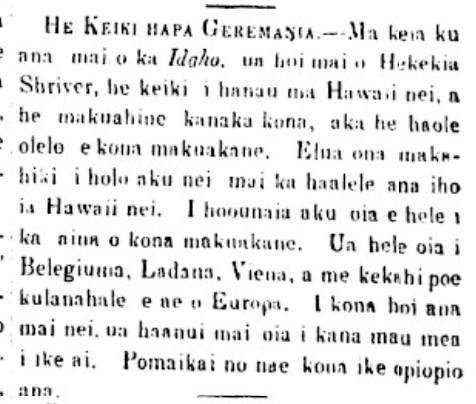 A Part German Boy.–With this arrival of the Idaho, Hekekia Shriver, a boy born here in Hawaii, returned. His mother is Hawaiian, but his father is a foreign-language-speaking haole. He has spent two years sailing since he left Hawaii nei. He was sent to go to the land of his father. He went to Belgium, London, Vienna, and some other towns of Europe. When he returned, he boasted of what he saw. Yet it was fortunate that he saw them in his youth.