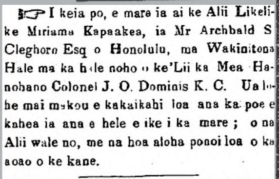 Tonight [September 22, 1870], the Alii Likelike Miriama Kapaakea will be wed to Mr. Archibald S. Cleghorn Esq. of Honolulu, at Wakinitona Hale [Washington Place], the residence of the Alii, HIs Excellency Colonel J. O. Dominis K. C. We hear that very few people have been called to come witness the marriage; just Alii, and the very personal friends of the groom’s side.