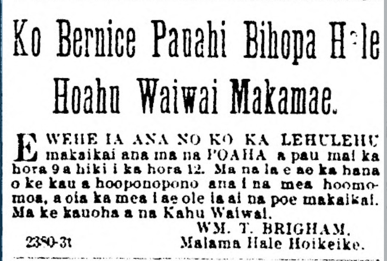 To be opened to visitors every Thursday from 9 to 12 o’clock. On the other days placing and arranging of the collections [na mea hoomomoa], and therefore visitors are not allowed. By order of the Trustees.