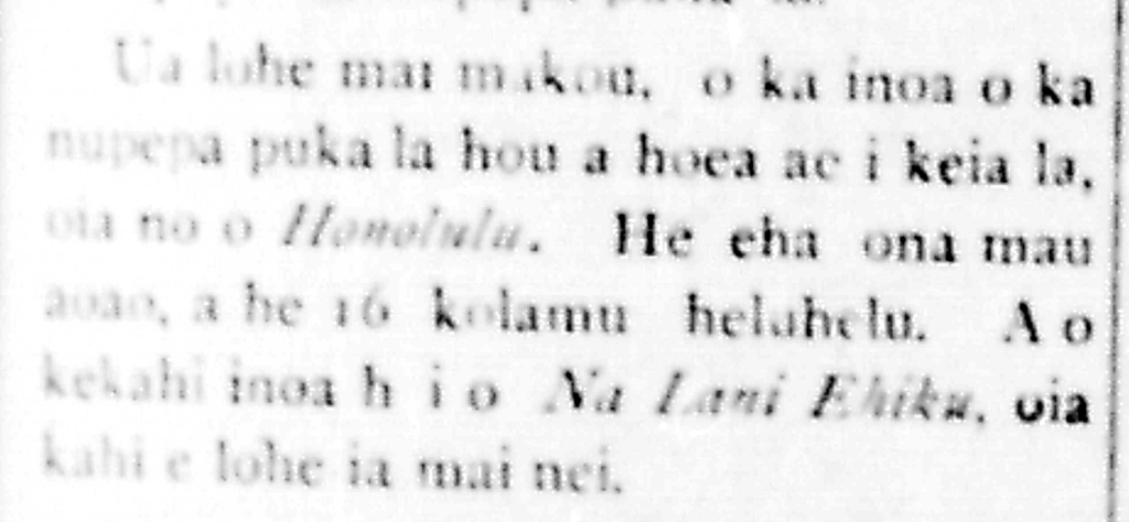 Because the paper coming into this office these days is a fraction, as well as the type setting boy of the Kuokoa cannot adequately fill the usual eight pages of the newspaper every week, being that the other type setters are busy with a lot of other jobs, so he has no help. It has been decided for now to cut down the paper to six pages.