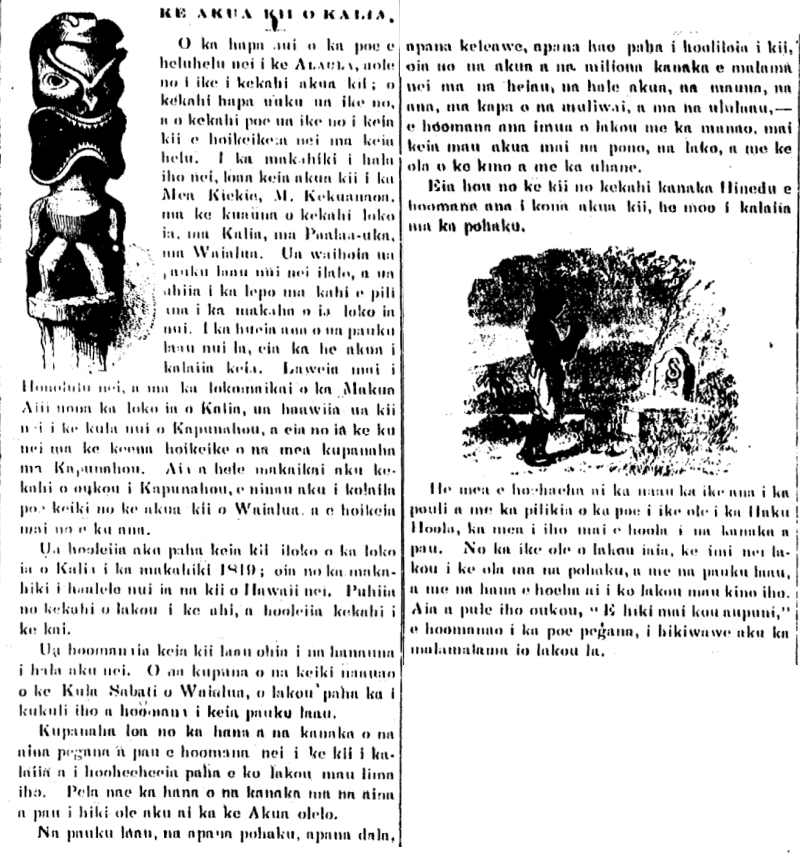 From what my kupuna told me, this Kanoa belonged to some chiefs and where the Kanoa was left was where a great house one stood, which was a place where the alii of the old times would enjoy themselves. And I was also informed of the alii to whom belonged the Kanoa; Kamoku was the man, and this is a hill that stands to this day in the middle of a field, and should a malihini go and see that Catholic church mentioned earlier, that place is Kanoa, and if you turn to look inland, about two miles away a hill stands like a heap of lava, and below all around it grow all sorts of plants, and from the middle until the top is pilipiliula grass, and today on its peak is a grove of tall pine trees planted after the owner of this land, Mr. C. Bertelman, died and his body was brought and buried some years ago; as for the chiefly woman, she was Kahili, and this is a land immediately seaward of this place, with a huge estuary where fishes of all types swim today.