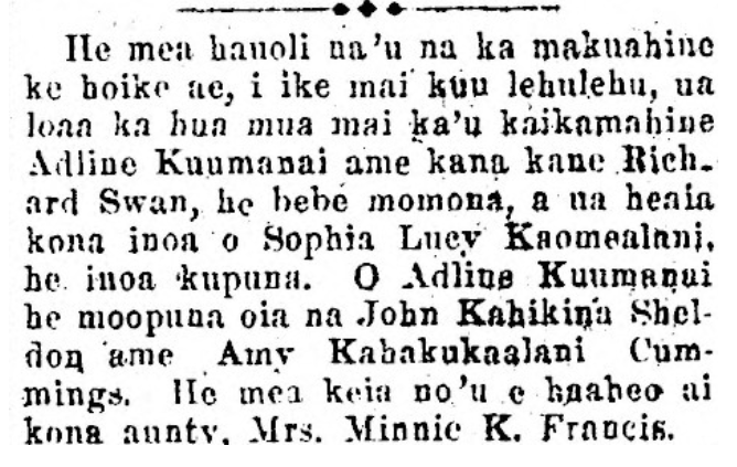 This is something joyous for me, the makuahine to announce, so that my many dear ones will know; my kaikamahine, Adline Kuumanai and her husband Richard Swan have had their first child, a plump babe, and she is named Sophia Lucy Kaomealani, an ancestral name. Adline Kuumanai is a grandchild of John Kahikina Sheldon and Amy Kahakukaalani Cummings. This is something that I, her aunty, Mrs. Minnie K. Francis, is proud of.