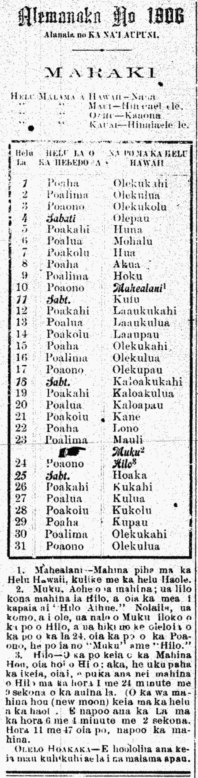 2. Muku—There is no moon; its moon is taken by Hilo, and that is why it is called “Hilo Aihue” [Thieving Hilo]. Therefore, Muku enters or is lost into the night of Hilo, and it can be said that the night of the 24th, is the night of Saturday, and is a night of “Muku” as well as “Hilo.”