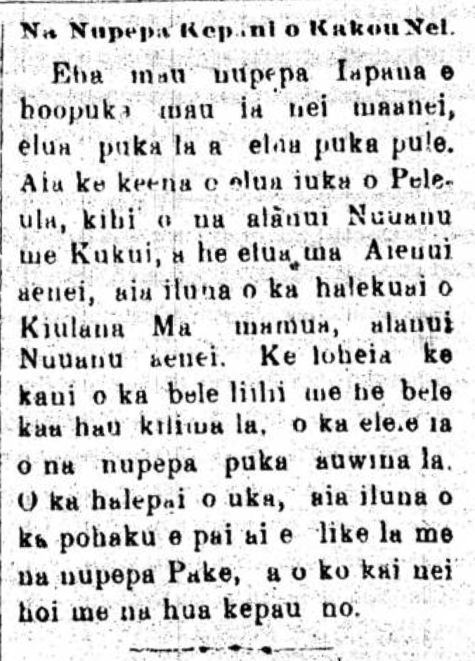 There are four Japanese newspapers being published regularly here, two dailies and two weeklies. Two of their offices are in the uplands of Peleula at the corner of Nuuanu and Kukui Streets; and two are at Aienui, above what was the shop of Chulan & Co. [Kiulana Ma], on Nuuanu Street. When we hear the little bell that sounds like the ice cream cart bell, it is the messenger of the afternoon newspaper. The press in the uplands does its printing using stone [lithograph] like the Chinese, and the lowland press uses movable type.