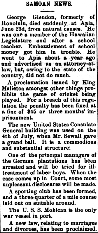 George Glendon, formerly of Honolulu, died suddenly at Apia, June 23d, from natural causes. He was one a member of the Hawaiian Legislature and after a school teacher. Embezzlement of school money got him in trouble. He went to Apia about a year ago and advertised as an attorney-at-law, but, owing to the state of the country, did not do much.