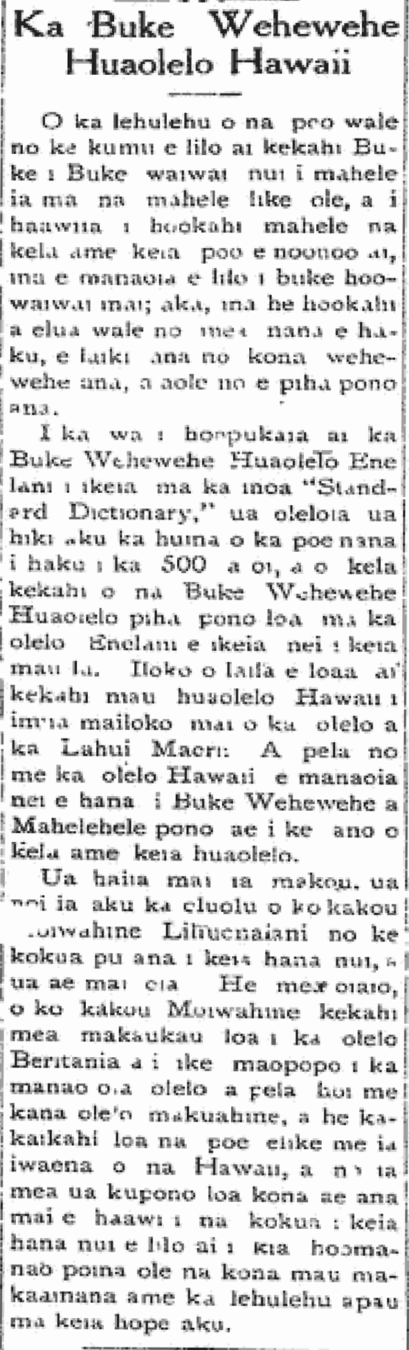 When the English Dictionary, known as the “Standard Dictionary,” was published, it is said that the number of people who produced it is 500 or more, and that is one of the most complete dictionaries of the English language known these days. Within it, there are some Hawaiian words found within the language of the Maoris. And so too with the Hawaiian language, the producing of a Dictionary which clearly defines each word, is now being considered.