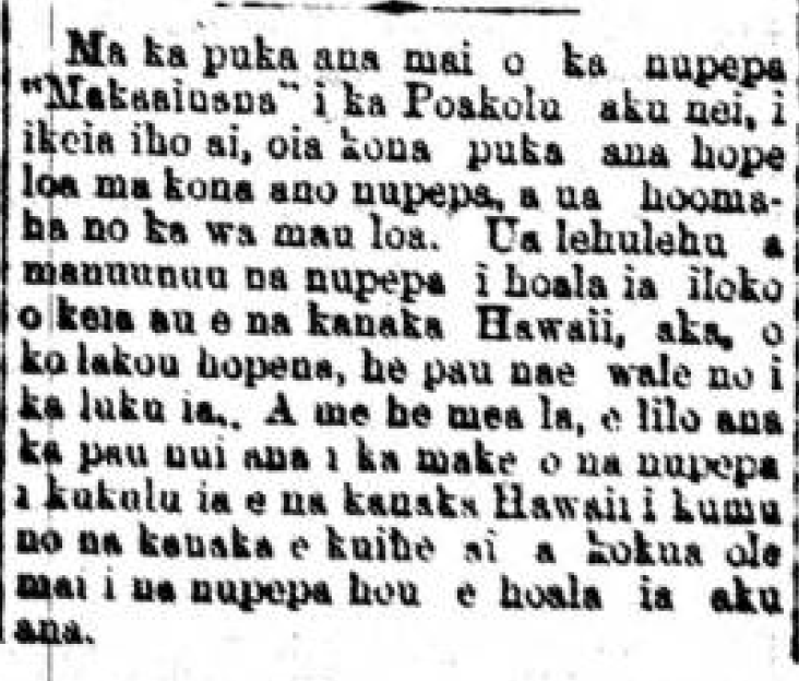 We see in these days going by, the youth are acquiring English, and they have no intention of pursuing the native language of their land of birth. It is clear that because the Hawaiian language government schools were discontinued, the large sources of water [poowai] that fed the canals [auwai] of knowledge of that language to the youth of Hawaii were cut off.