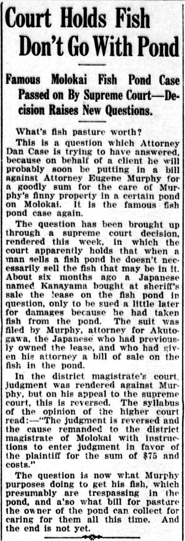 This is a question which Attorney Dan Case is trying to have answered, because on behalf of a client he will probably soon be putting in a bill against Attorney Eugene Murphy for a goodly sum for the care of Murphy’s finny property in a certain pond on Molokai. It is the famous fish pond case again.