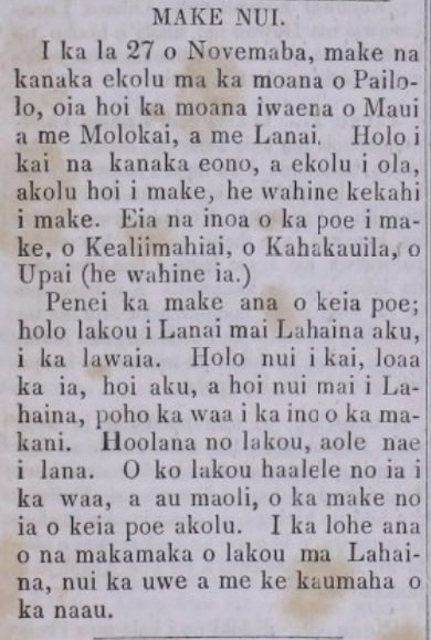 A MAN SNAGGED BY A HOOK.–This past Saturday, some people went to Waikiki to catch flying fish by driving them into a net using their paddles [pahoe malolo]. And as usual, one of them dove down to watch the fish go in, that is what Mauhelemoku did. And the third time he dove down, there was dangling line and a hook of someone fishing. The canoe with the hook moved forward, and the mouth of that man was hooked. The one that the hook belonged to thought it was a fish and he yanked it up. The man along with the hook went came down and Dr. Hillebrand took it out. Eh! This is something new this flying fish fishing season.