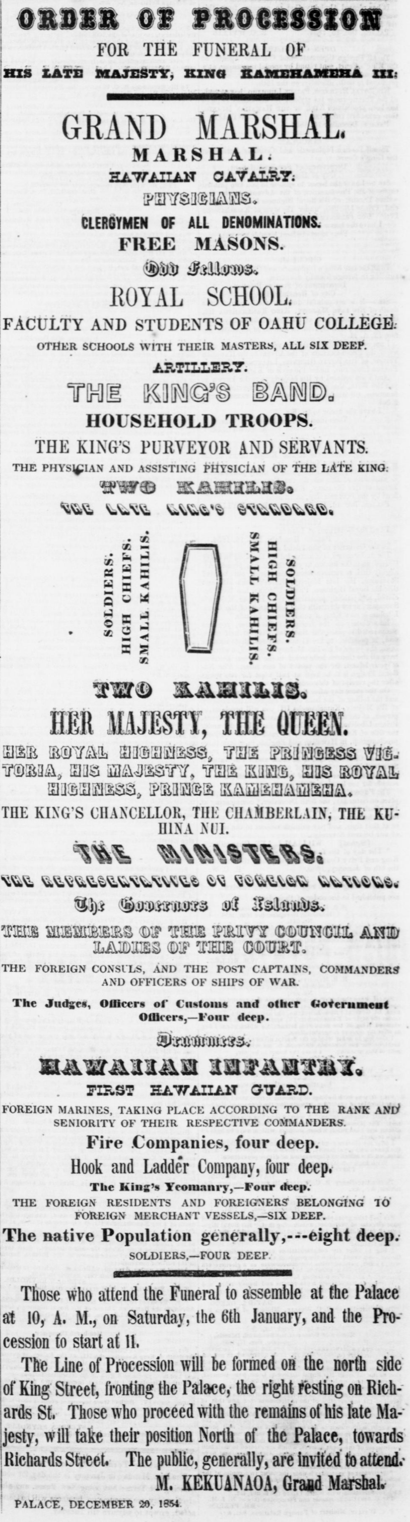 Two long lines of ropes, bound with black and white ribbon, formed the harness with which the poolas drew the catafalque. Just before the coffin was removed from the throne room, the poolas formed a double line in front of the catafalque which reached almost to the makai entrance to the Palace grounds, each man taking hold of the rope. as the coffin was carried down the steps, the poolas removed their hats and stood at attention, facing the catafalque. After the ceremonies at the entrance to the palace were over, they began their steady march to the mausoleum, slowly drawing the catafalque after them.