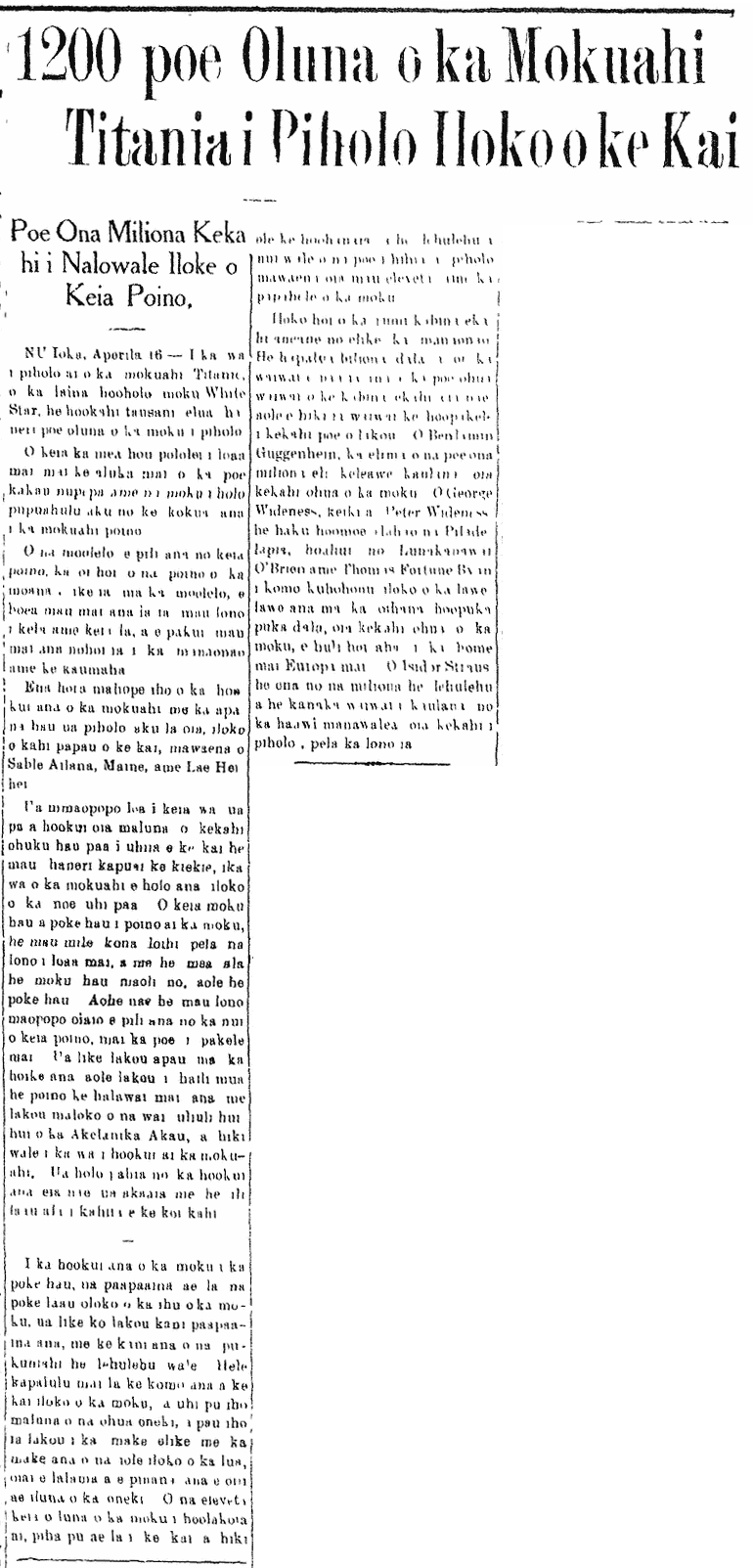 [This article appears to have been taken from the first page story of the Hawaiian Gazette on April 16, 1912. All three Hawaiian-Language Newspapers of the time were covering this tragic story.]