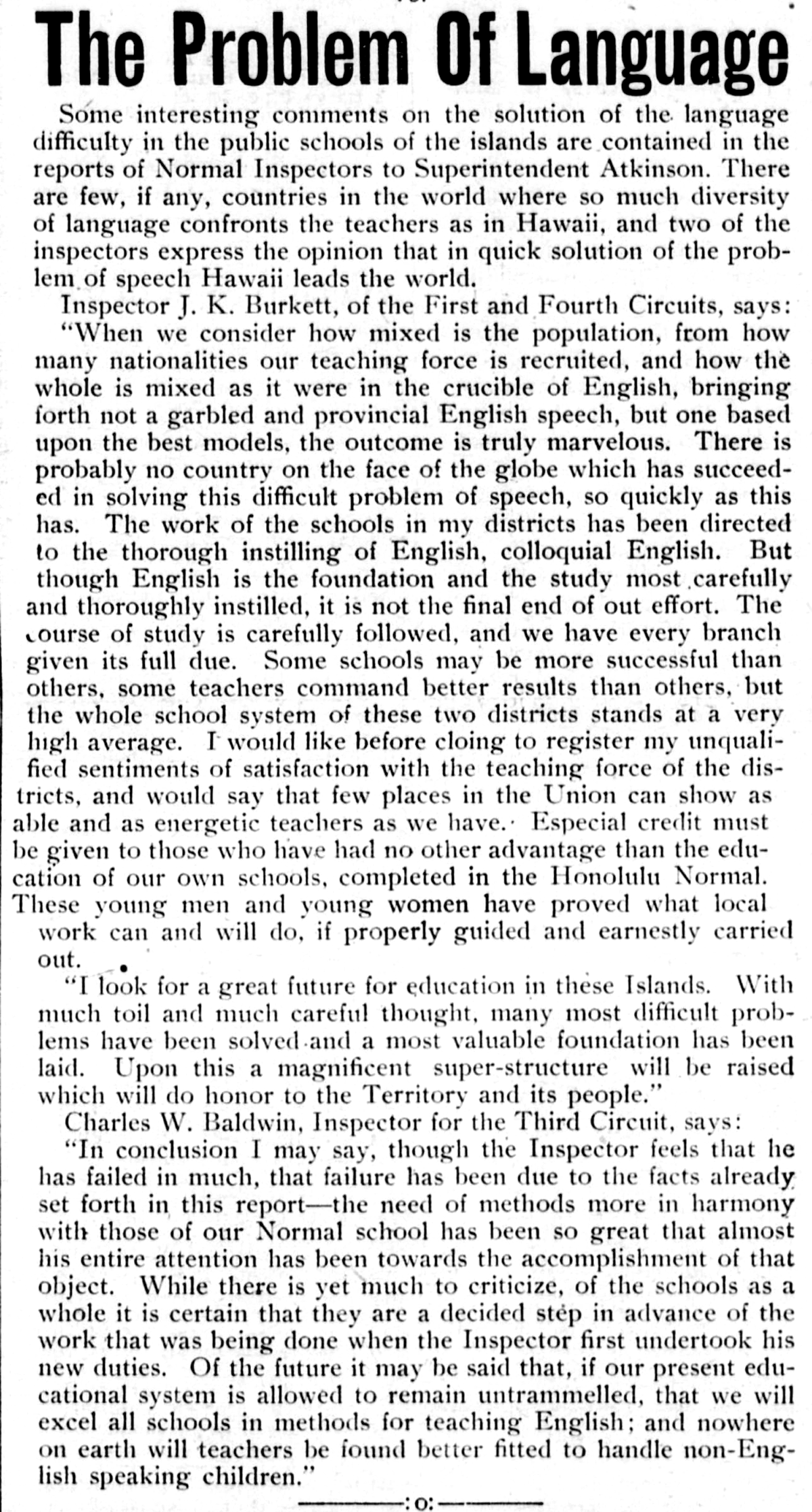 “When we consider how mixed is the population, from how many nationalities our teaching force is recruited, and how the whole is mixed as it were in the crucible of English, bringing forth not a garbled and provincial English speech, but one based upon the best models, the outcome is truly marvelous. There is probably no country on the face of the globe which has succeeded in solving this difficult problem of speech, so quickly as this has. The work of the schools in my districts has been directed to the thorough instilling of English, colloquial English. But though English is the foundation and the study most carefully and thoroughly instilled, it is not the final end of our effort. The course of study is carefully followed, and we have every branch given its full due. Some schools may be more successful than others, some teachers command better results than others, but the whole school system of these two districts stands at a very high average. I would like before closing to register my unqualified sentiments of satisfaction with the teaching force of the districts, and would say that few places in the Union can show as able and as energetic teachers as we have. Especial credit must be given to those who have had no other advantage than the education of our own schools, completed in the Honolulu Normal. These young men and young women have proved what local work can and will do, if properly guided and earnestly carried out.