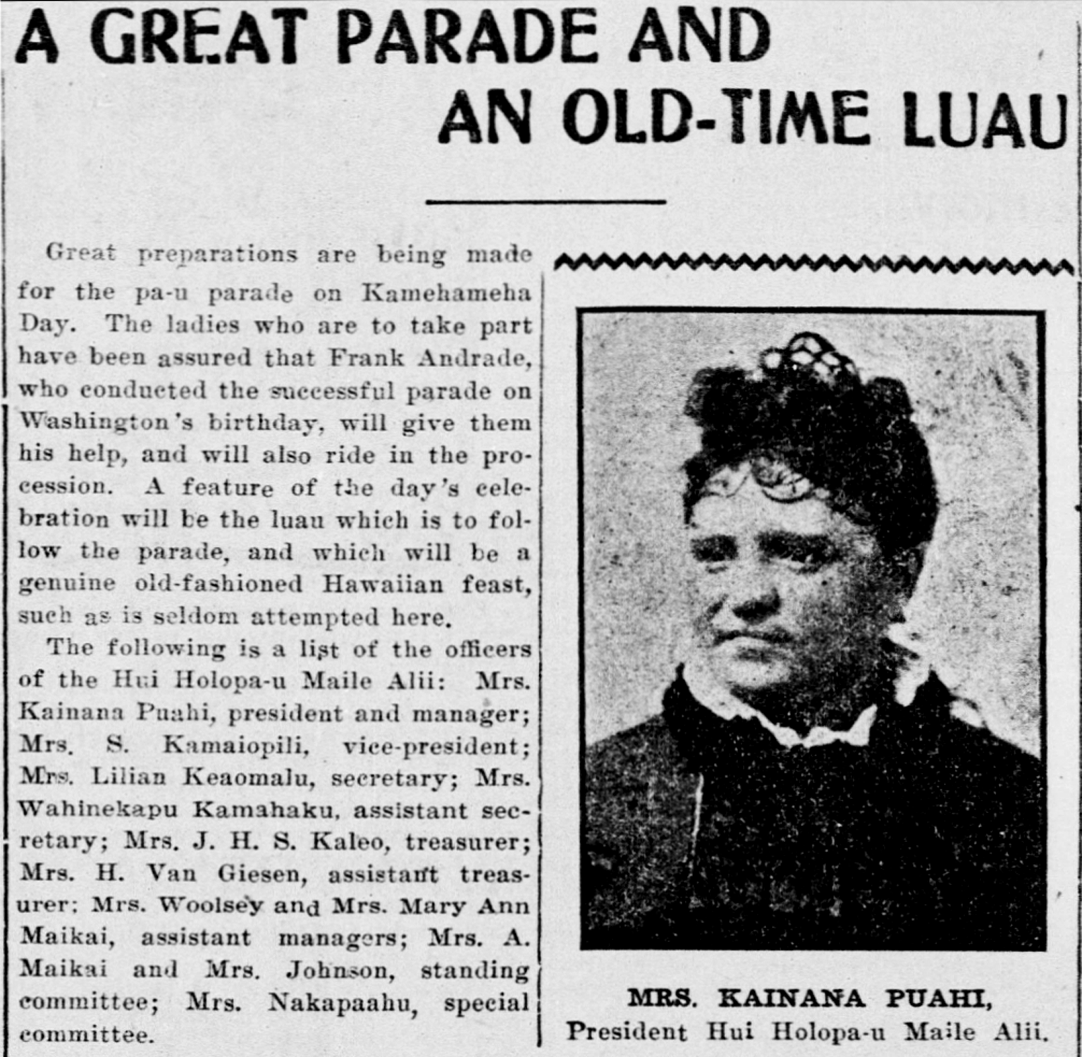 Luau and transportation, Charles S. Crane, S. P. Correa; games, C. S. Crane, E. Dekum, L. H. Mesick, Jack Densham, John Traut; dance, Paul Pereira; program and printing, L. H. Mesick, G. J. Boisse; official photographer, James Williams; Music, J. Kupau; refreshments, George Seyde.