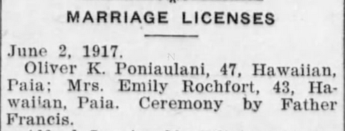Mrs. Emily Rochfort marries Oliver Knox Poniaulani, 1917.