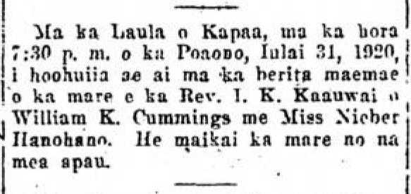 In the expanse of Kapaa, at 7:30 p. m. on Saturday, July 31, 1920, joined together in the pure covenant of marriage by Rev. I. K. Kaauwai [Isaiah Kalunakanawai Kaauwai] were William K. Cummings and Miss Nieber Hanohano. Marriage is a fine thing for all.
