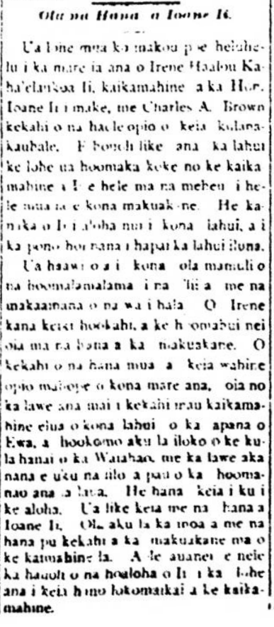 Our readers heard earlier of the marriage of Irene Haalou Kahalelaukoa Ii, daughter of the late Hon. John Ii, to Charles A. Brown, one of the young haole of this town. The lahui will all be joyous when they hear that the daughter of Ii has began at once to walk in the footsteps walked before by her father. Ii was a man who felt much aloha for his lahui, and the need for him to raise up his people.