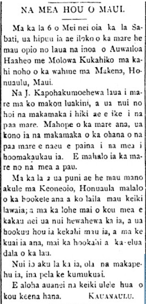 On the 6th of May, that being a Sunday, joined together in marriage were two youths named Auwailoa Haaheo and Molowa Kukahiko, at the residence of the woman in Makena, Honuaulu, Maui.