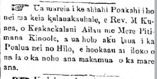 Married this past Monday evening in this town by Rev. M. Kuaea, was Keakaokalani Ailau and Mere Pitimana Kinoole. And the two sailed on Tuesday for Hilo, to spend pleasantly their first days of marriage.