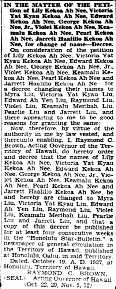 Now, therefore, by virtue of the authority in me by law vested, and thereunto enabling, I, Raymond C. Brown, Acting Governor of the Territory of Hawaii, do hereby order and decree that the names of Lily Kekoa Ah Nee, Victoria Yat Kyau Kekoa Ah Nee, Edward Kekoa Ah Nee, George Kekoa Ah Nee, Jr., Violet Kekoa Ah Nee, Keamalu Kekoa Ah Nee, Pearl Kekoa Ah Nee and Jarrett Haalilio Kekoa Ah Nee, be and hereby are changed to Myra Liu, Victoria Yat Kyau Liu, Edward Ah Yen Liu, Raymond Liu, Violet Liu, Keamalu Meribah Liu, Pearlie Liu and Jarrett Liu, and that a copy of this decree be published for at least four consecutive weeks in the “Honolulu Star-Bulletin,” a newspaper of general circulation in the Territory of Hawaii, published at Honolulu, Oahu, in said Territory.